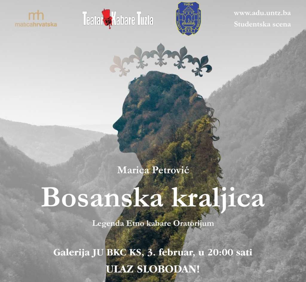 Predstava “Bosanska kraljica” autorice Marice Petrović, koju je režirao Vlado Kerošević i u kojoj ulogu Katarine Kosača – Kotromanić ostvaruje tuzlanska glumica Ivana Petrović, bit će izvedena u Galeriji Bosanskog kulturnog centra (BKC) u Sarajevu u subotu, 3. veljače.
