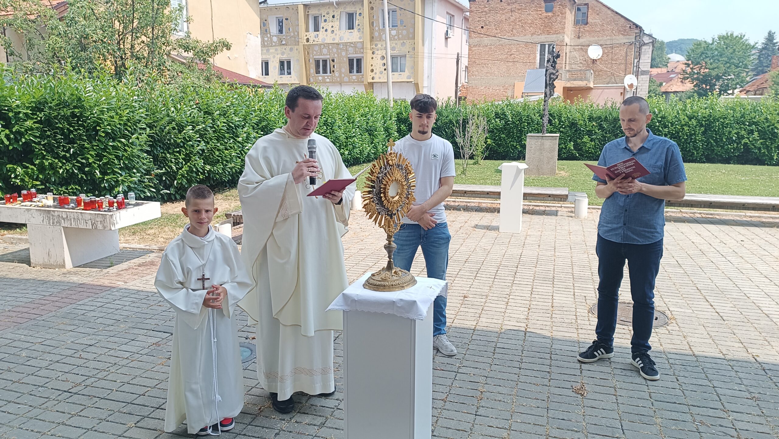 Nakon pričesti vjernici su u procesijskom zajedništvu, predvođenom Presvetim oltarskim sakramentom, izašli iz crkve u dvorište gdje je nastavljena tjelovska vanjska proslava. Tu je nastavljen ophod s pokaznicom uz pjevanje pjesama koje veličaju euharistiju, čitanje tekstova iz Svetog pisma koji govore o ustanovljenju euharistijskog sakramenta i ranom čašćenju prvih kršćana Presvetog tijela i krvi Kristove.