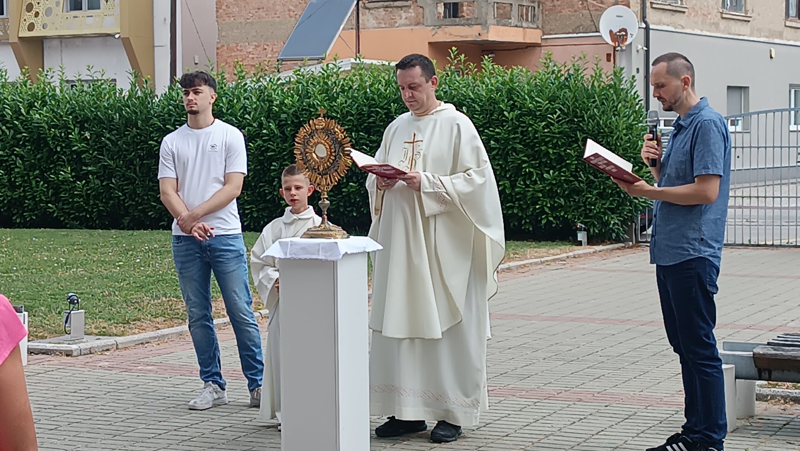 Nakon pričesti vjernici su u procesijskom zajedništvu, predvođenom Presvetim oltarskim sakramentom, izašli iz crkve u dvorište gdje je nastavljena tjelovska vanjska proslava. Tu je nastavljen ophod s pokaznicom uz pjevanje pjesama koje veličaju euharistiju, čitanje tekstova iz Svetog pisma koji govore o ustanovljenju euharistijskog sakramenta i ranom čašćenju prvih kršćana Presvetog tijela i krvi Kristove.