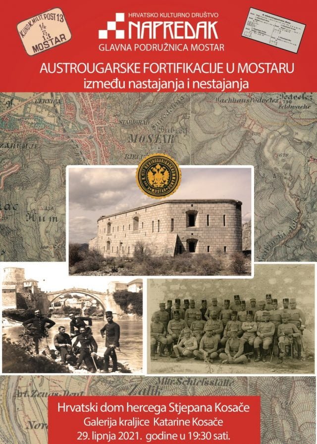 HKD Napredak Glavna podružnica Mostar organizira u utorak 29. lipnja 2021. godine s početkom u 19:30 sati u Hrvatskom domu hercega Stjepana Kosače predavanje o temi „ „Austrougarske fortifikacije u Mostaru između nastajanja i nestajanja“.