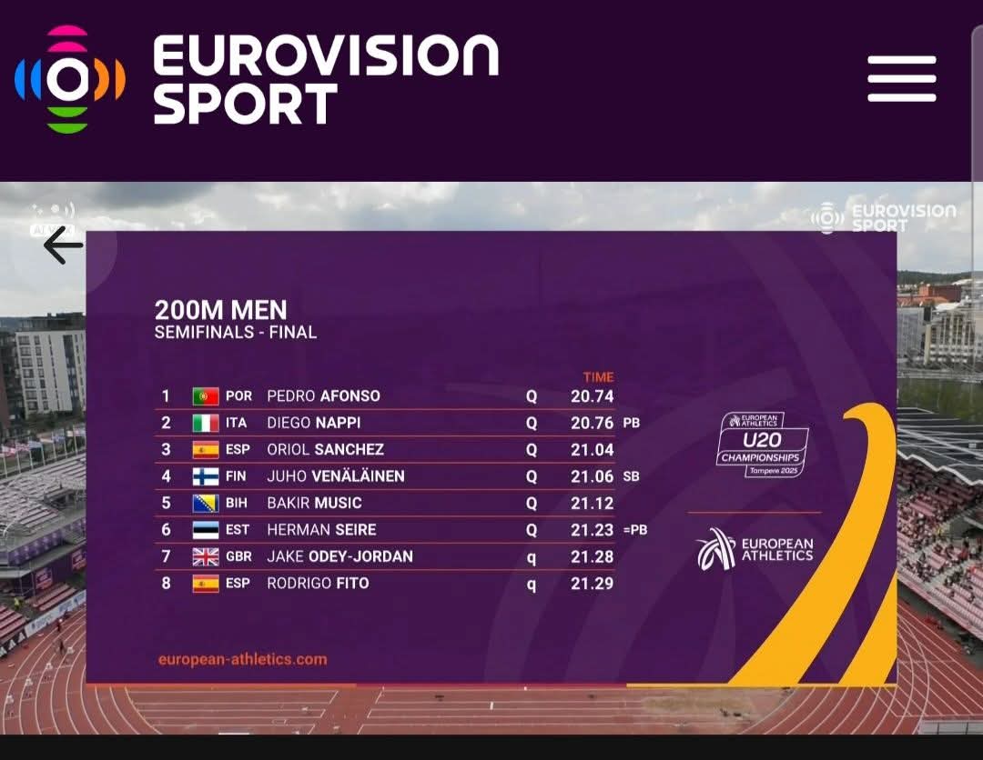 Tuzlanski sprinter Bakir Musić izborio je izravan plasman u finale na 200 metara na Evropskom atletskom prvenstvu do 20 godina u finskom Tampereu te će večeras u 17:45 sati trčati i za medalju.