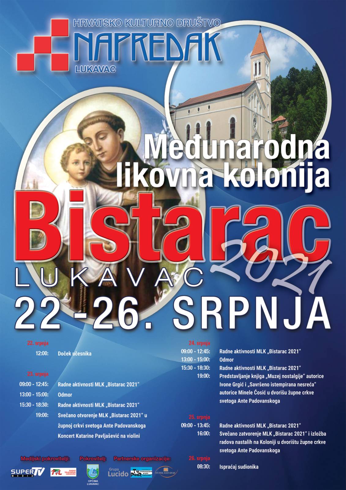 Međunarodna likovna kolonija Bistarac koju organizira HKD Napredak Lukavac večeras će biti svečano otvorena u Lukavcu u Župnoj crkvi Svetog Ante Padovanskog. Prošlogodišnja kolonija je morala biti odgođena zbog pandemije koronavirusa, ali se organizatori nadaju da će ove godine uspjeti nadoknaditi sve što je propušteno. Međunarodna likovna kolonija traje do nedjelje 25. srpnja, a tijekom njenog održavanja bit će upriličeni i drugi kulturni događaji. U razgovoru za Hrvatski glasnik, predsjednica Napretkove podružnice u Lukavcu Božana Vilušić – Tomić ističe da poruke koje žele poslati je da umjetnost spaja ljude, bez obzira odakle dolazili.