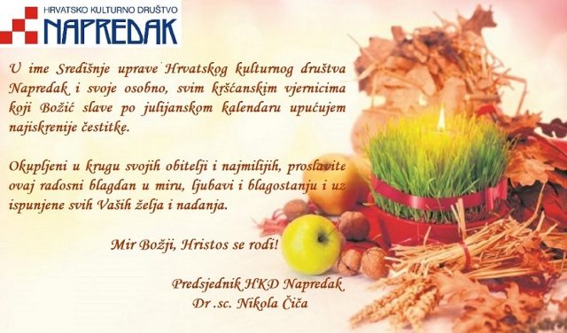 U ime Središnje uprave Hrvatskog kulturnog društva Napredak i svoje osobno, svim kršćanskim vjernicima koji Božić slave po julijanskom kalendaru upućujem najiskrenije čestitke.