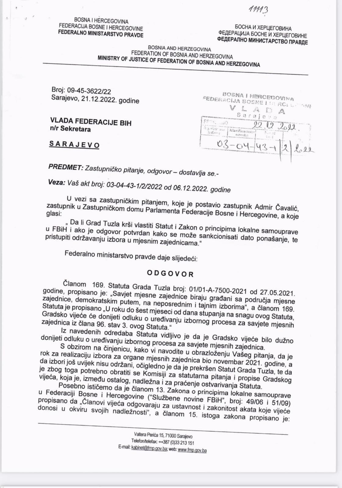 Nakon što je uputio zastupničko pitanje Ministarstvu pravde Federacije BiH „Krši li Grad Tuzla vlastiti Statut i Zakon o principima lokalne samouprave i ako je odgovor potvrdan kako se može sankcionirati dato pojašnjenje te pristupiti održavanju izbpora u mjesnim zajednicama“, zastupnik u Zastupničkom domu Parlamenta Federacije BiH Admir Čavalić veoma je brzo dobio odgovor.