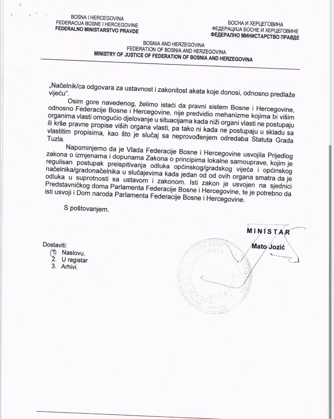 „Želimo istaći da pravni sistem Bosne i Hercegovine , odnosno Federacije BiH, nije predvidio mehanizme kojima bi višim organima vlasti omogućio djelovanje u situacijama kada niži organi vlasti ne postupaju ili krše pravne propise viših organa vlasti pa tako ni kada ne postupaju u skladu s vlastitim propisima, kao što je slučaj sa neprovođenjem Grada Tuzla“, pojasnio je Mato Jozić, ministar pravde Federacije BiH.