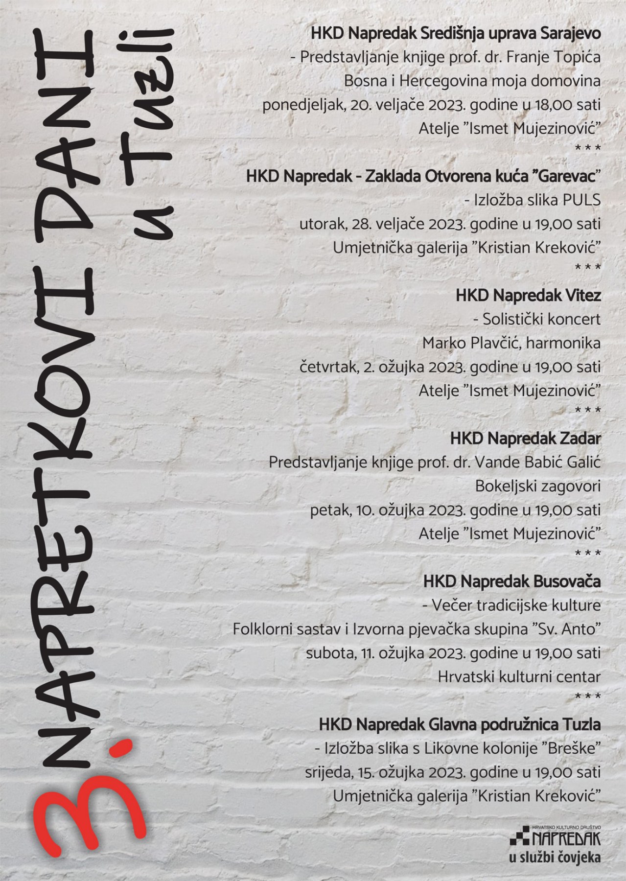Treći Napretkovi dani koje organizira HKD Napredak Glavna podružnica Tuzla započinju u ponedjeljak 20. veljače, promocijom knjige „Bosna i Hercegovina naša domovina“, počasnog predsjednika HKD Napredak prof. dr. Franje Topića.