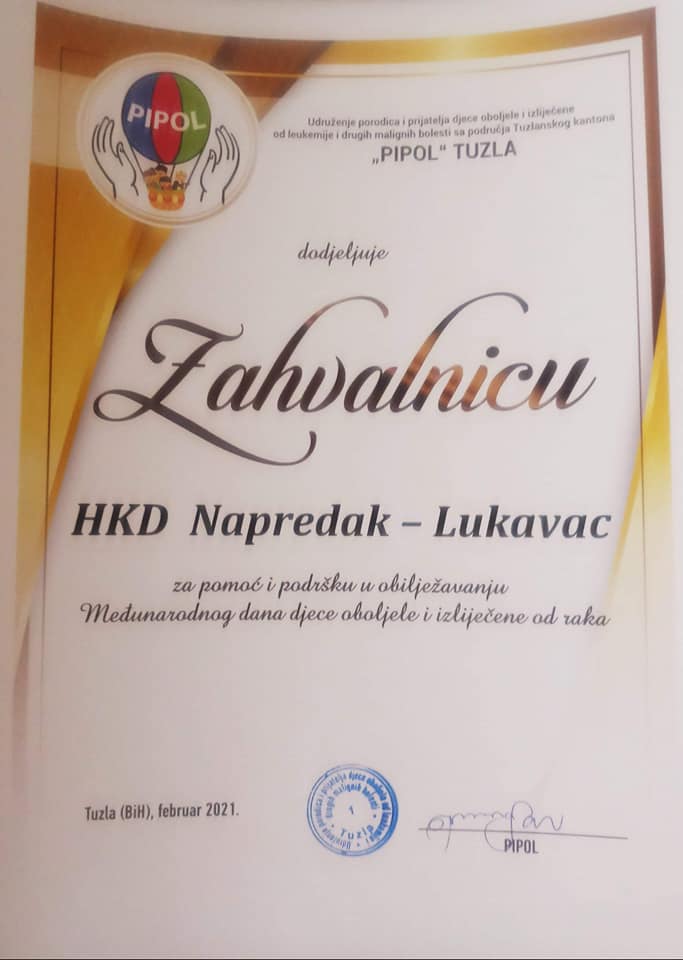 „Korizma je, pa smo i ove godine odlučili da u Napretku nešto učinimo humano. Vidjela sam, da je 15. veljače Međunarodni dan djece oboljele i izliječene od malignih oboljenja. U PIPOL-u rade maskice sa zlatnom vrpcom, a kupovinom maskice već činite nešto za oboljelu djecu. Ušla sam na njihovu web stranicu… Postavljene su slike dječice s roditeljima koji su izliječeni, ali dalje listajući bilo je i posmrtnica. Udruženje povezuje djecu i roditelje, vjerojatno kroz psihološku pomoć, a takva pomoć im je potrebna 24 sata. Prijedlog da kupovinom maskica makar malo pomažemo toj djeci u Napretku je bio odmah prihvačen“, ispričala nam je Božana Vilušić Tomić, predsjednica HKDNapredak Lukavac.