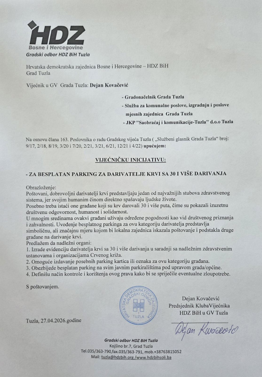 Na današnjoj sjednici Gradskog vijeća Tuzla, vijećnik Dejan Kovačević uputio je vijećničku inicijativu kojom predlaže uvođenje besplatnog parkinga za dobrovoljne darivatelje krvi koji su krv darovali 30 i više puta.