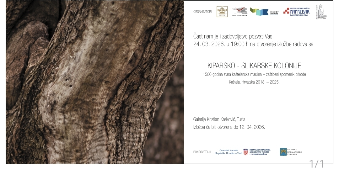 Otvorenje izložbe održat će se 24. ožujka 2026. u 19:00 sati u Galeriji Kristian Kreković u Tuzli, a posjetitelji će imati priliku uživati u radovima nastalim u razdoblju od 2018. do 2025. godine na zaštićenom spomeniku prirode – 1500 godina staroj kaštelanskoj maslini u Kaštel Štafiliću, Hrvatska.