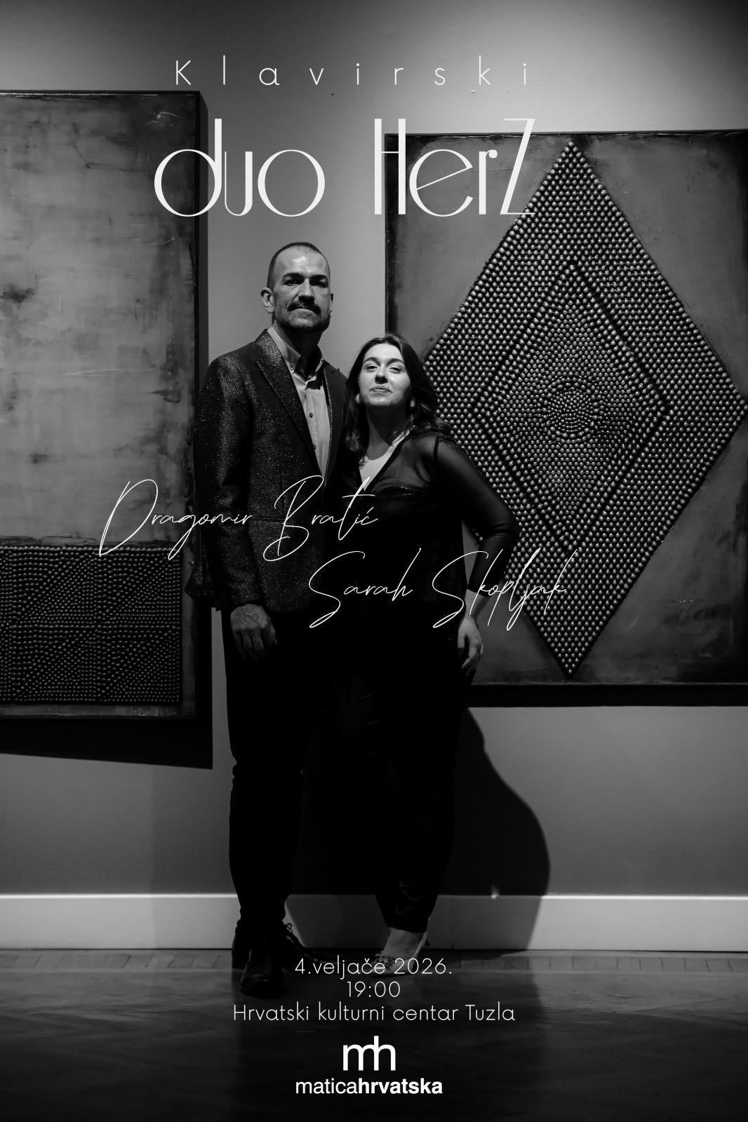 Hrvatski kulturni centar u Tuzli bit će u utorak, 4. veljače 2026. godine, s početkom u 19 sati, mjesto susreta publike s profinjenim zvukom klasične glazbe. U organizaciji Matice hrvatske Tuzla, održat će se koncert klavirskog dua „Herz“, koji čine pijanisti Dragomir Bratić i Sarah Skopljak.