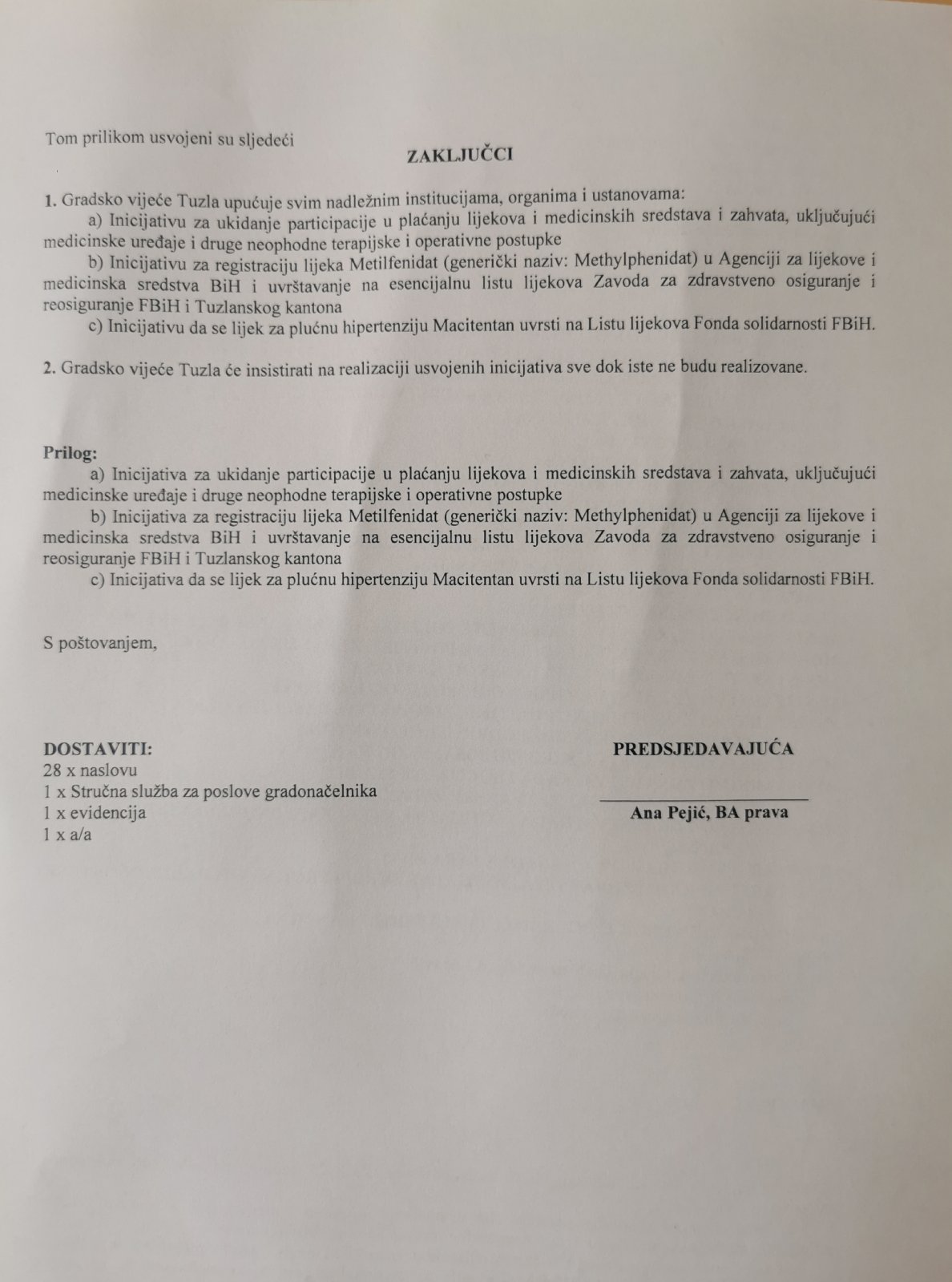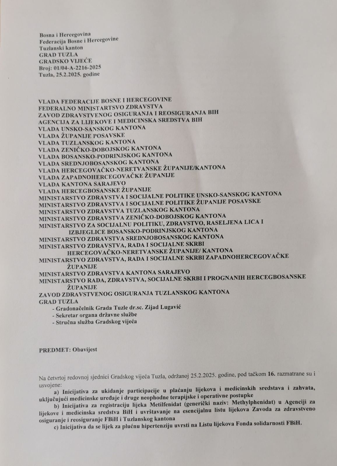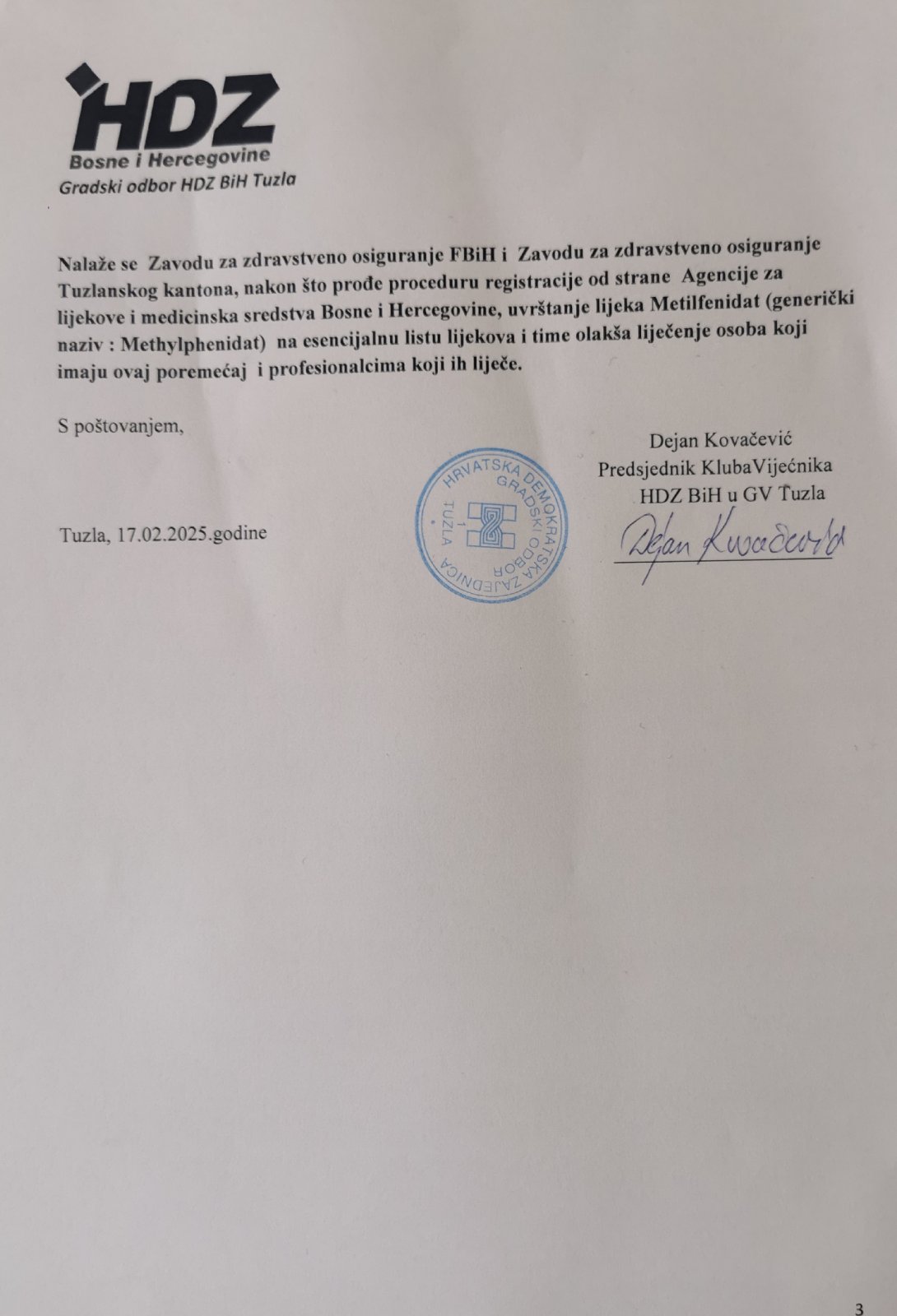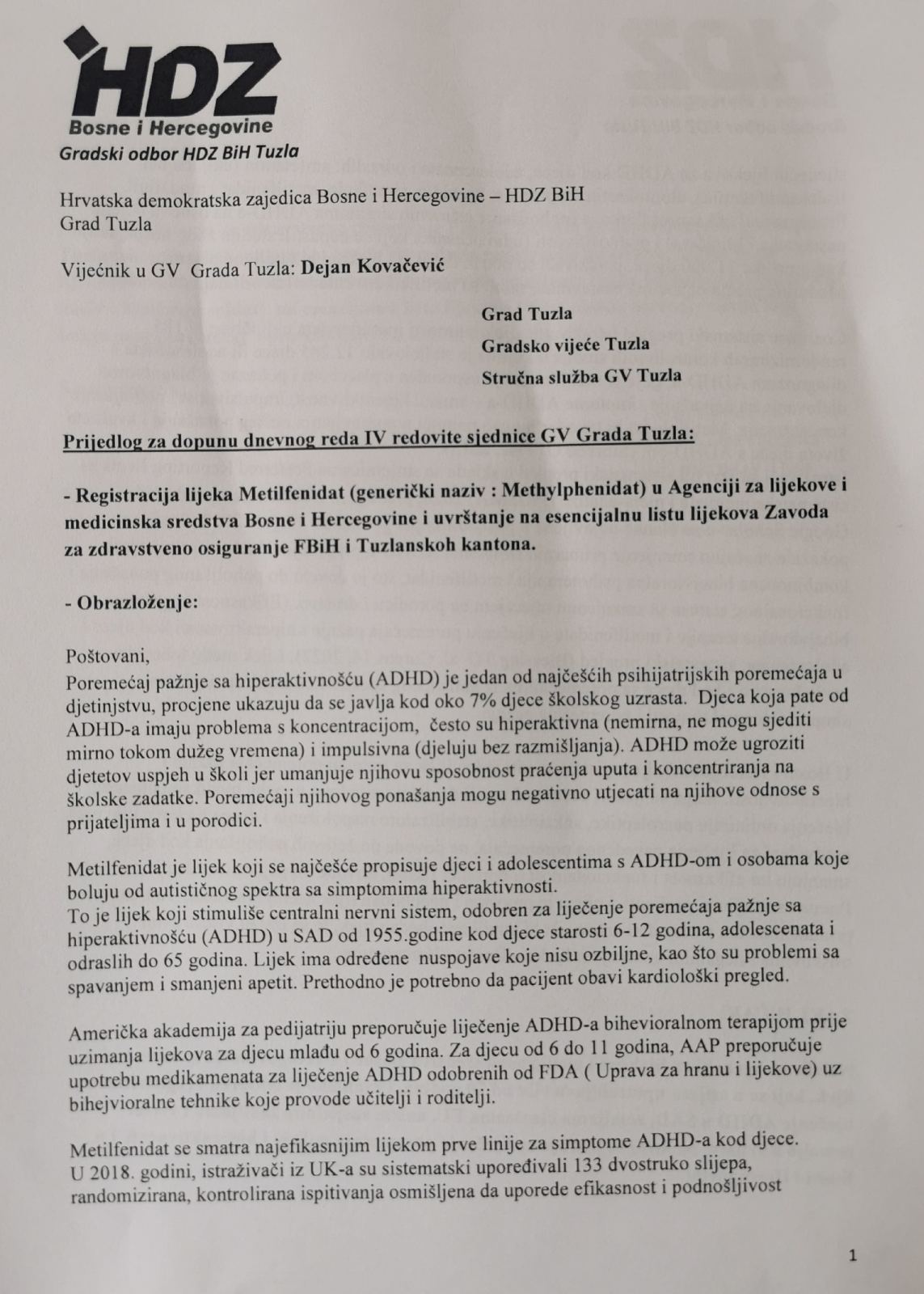 Gradsko vijeće Grada Tuzla je na Sjednici održanoj u utorak 25. veljače dalo jednoglasnu potporu inicijativi predsjednika Kluba vijećnika HDZ BiH Dejana Kovačevića da lijek Methylphenidat bude registriran u Agenciji za lijekove i medicinska sredstva Bosne i Hercegovine te da nakon registracije bude uvršten na esencijalnu listu lijekova Zavoda za zdravstvenog osiguranja i reosiguranja Federacije BiH i Tuzlanskog kantona.
