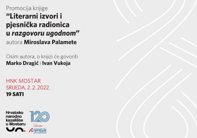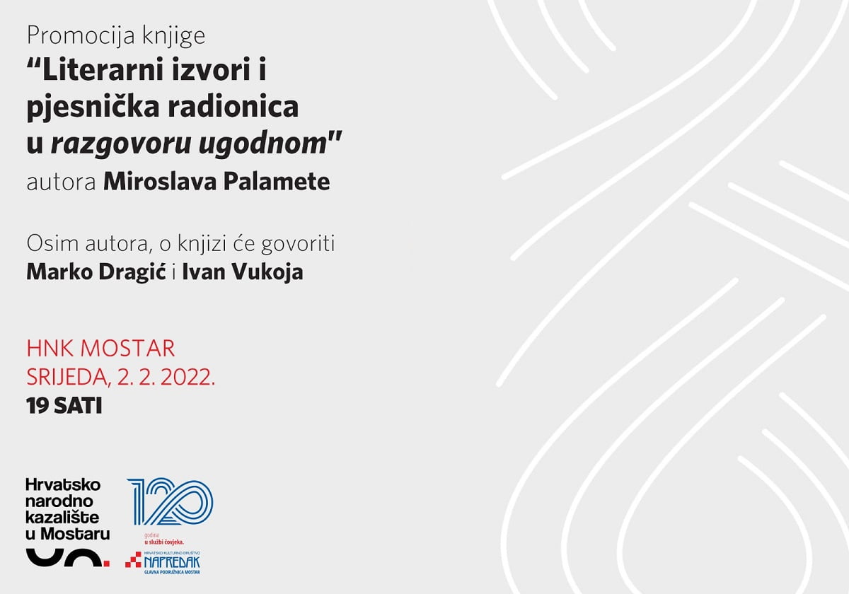 U organizaciji HKD “Napredak” Glavna podružnica Mostar i Hrvatskog narodnog kazališta u Mostaru, u srijedu 2. veljače 2022. godine, s početkom u 19 sati u Hrvatskom narodnom kazalištu u Mostaru bit će upriličena promocija knjige “Literarni izvori i pjesnička radionica u razgovoru ugodnom” autora Miroslava Palamete.