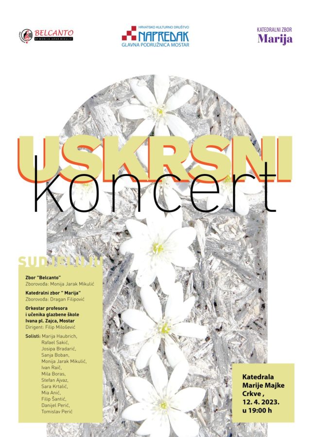 U organizaciji HKD Napredak Glavna podružnica Mostar, Katedralnog mješovitog zbora Marija i Škole pjevanja Belcanto,  u srijedu  12. travnja 2023. godine s početkom u 19:00 sati u Katedrali Marije Majke  Crkve u Mostaru održat će se Uskrsni koncert.