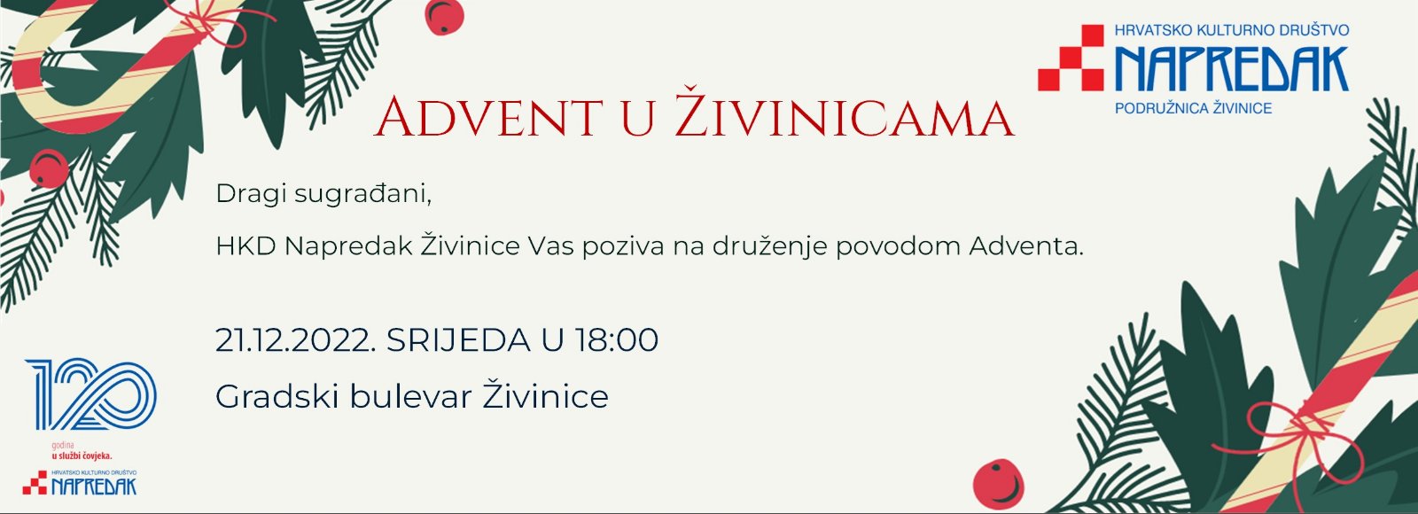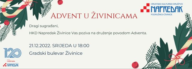 HKD Napredak podružnica Živinice organizira niz aktivnost povodom Adventa. Druženje za sugrađanima će se održati u srijedu, 21. prosinca s početkom u 18 sati na Gradskom bulevaru Živinice