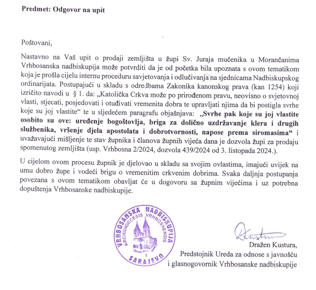 Pred brojne novinare danas je stao i župnik Župe Morančani, Ivo Paradžik. Tvrdi da je sve urađeno po zakonu, a novinarima je pokazao i dokumente. Također, oglasila se i Vrhbosanska nadbikupija.