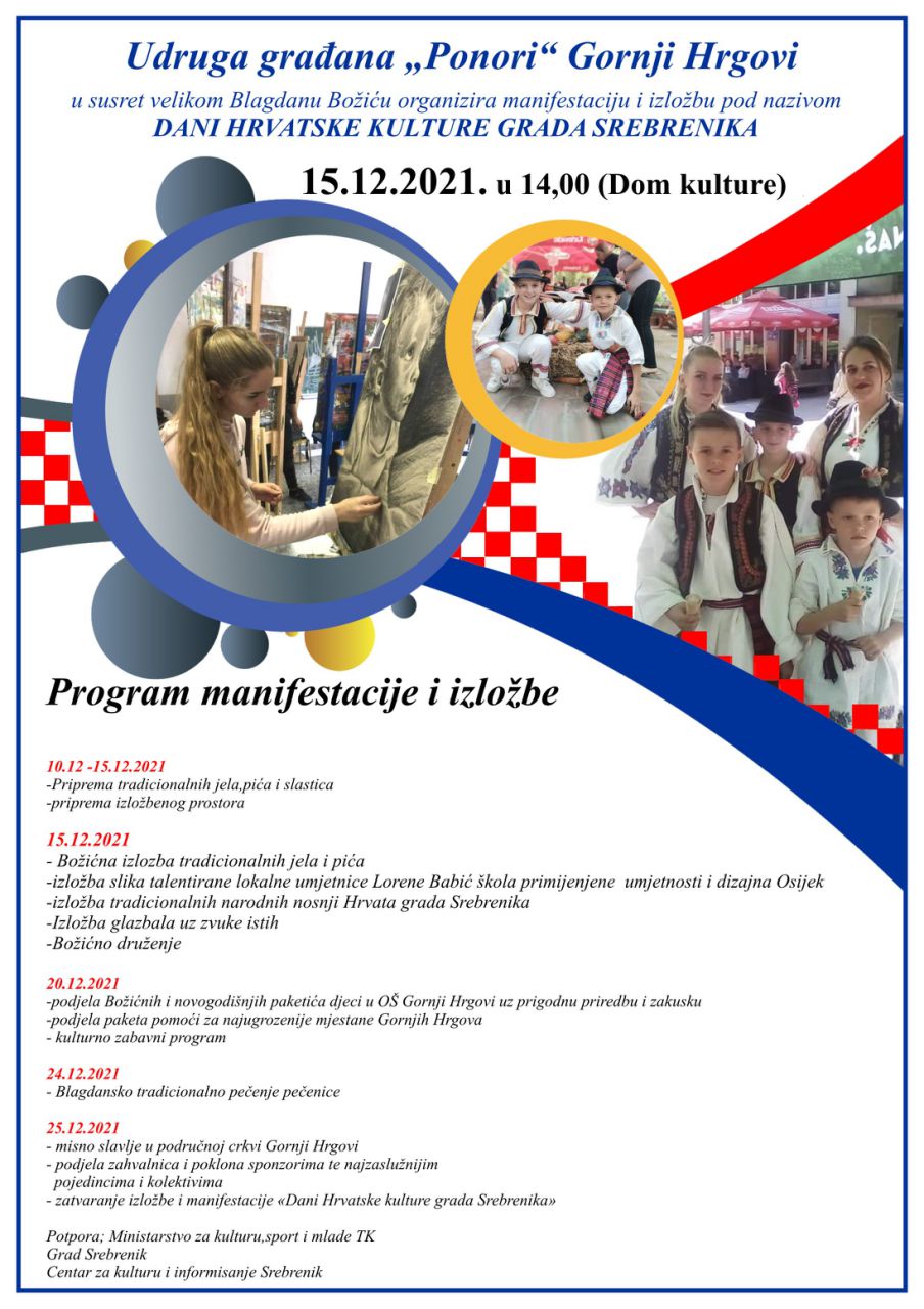 Za nekoliko dana u Srebreniku, lijepom gradiću na Sjeveroistoku Bosne, u povodu božićnih blagdana započinju Dani hrvatske kulture Grada Srebrenika. Naime, Udruga građana Ponori iz Gornjih Hrgova želi sačuvati tradiciju, kulturu i običaje hrvatskog naroda.