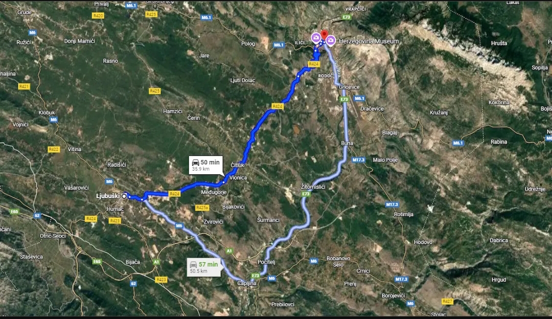 Da bi se stiglo iz Ljubuškog do Mostara uz poštivanje prometnih propisa potrebno je najmanje 46 minuta vožnje, uz uvjet da nema gužve na cesti.