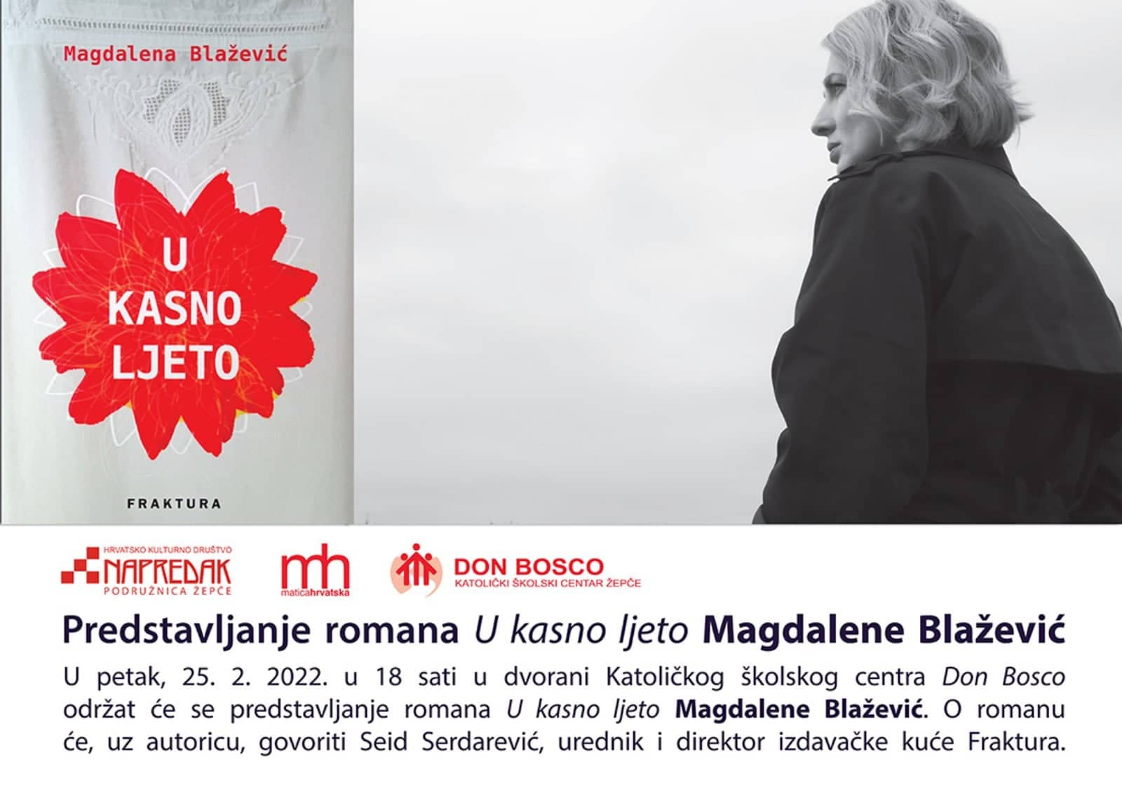 U petak, 25. veljače s početkom u 18,00 sati u dvorani Katoličkog školskog centra Don Bosco a pod potkroviteljstvom HKD Napredak, podružnice Žepče biti će upriličeno predstavljanje romana “U kasno ljeto ” autorice Magdalene Blažević.