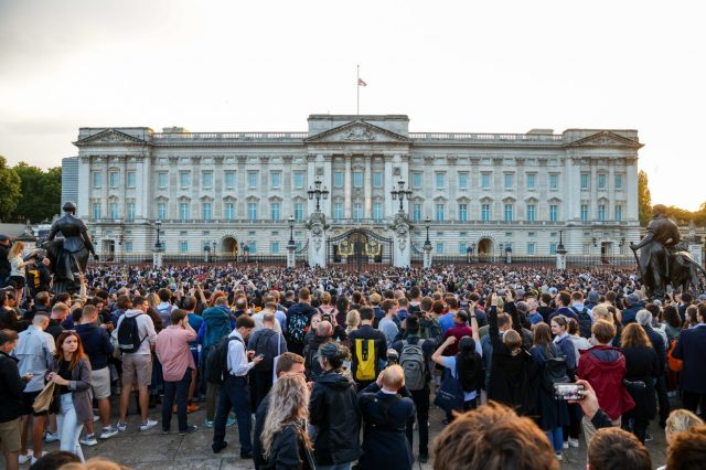 Crowds Gather to pay their respects outside Bucking Palace on September 8, 2022 after the death of Queen Elizabeth II, London, UK Crowds gather outside Buckingham Palace, London, UK - 08 Sep 2022,Image: 720742167, License: Rights-managed, Restrictions: , Model Release: no