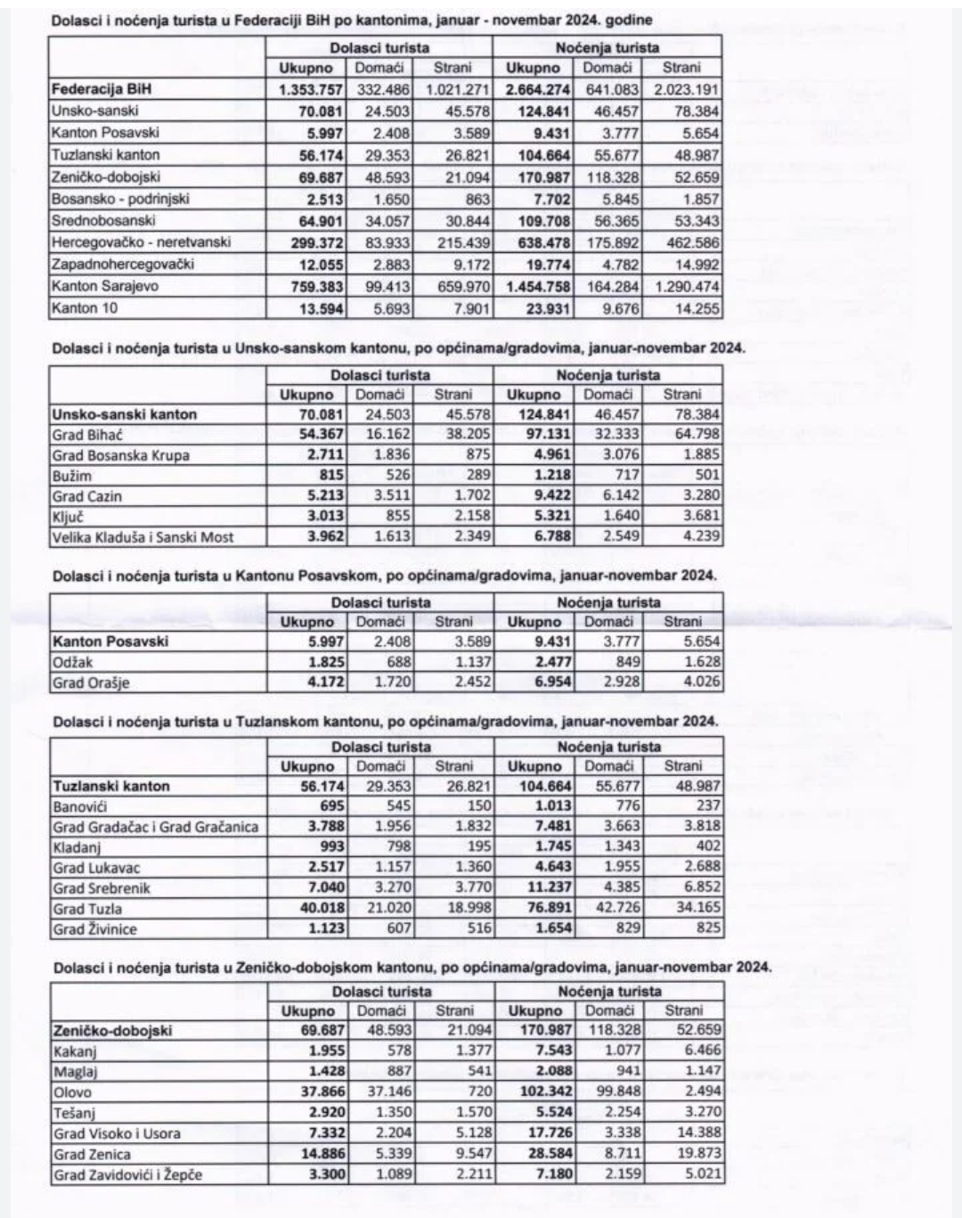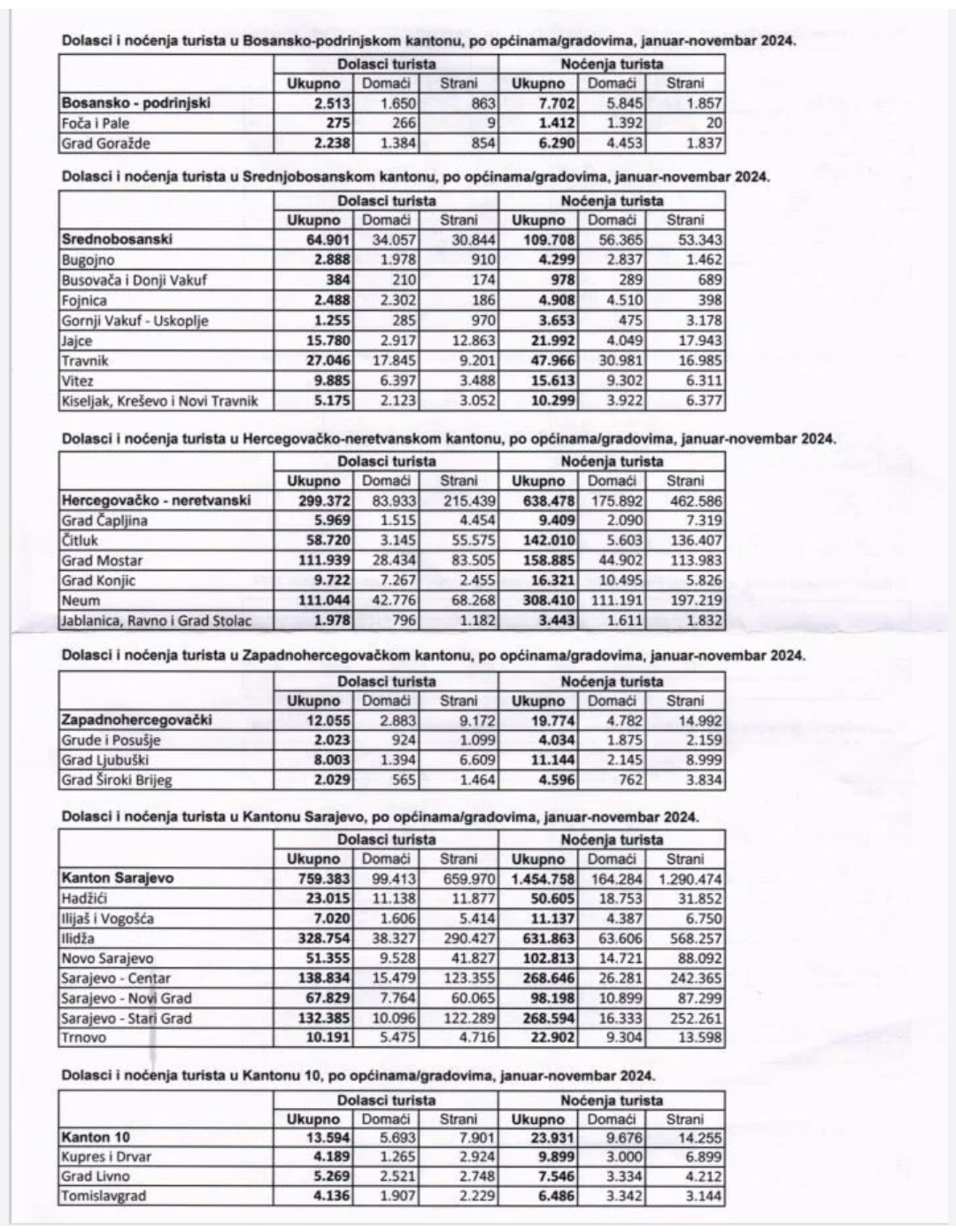 Prema podacima Federalnog Zavoda za statistiku od siječnja do studenog prošle godine u Fderaciji BiH je bilo 1,3 milijuna dolazaka turista (332.400 domaćih i 1,02 milijuna stranih) dok je bilo 2,66 milijuna noćenja turista (641.000 domaćih i 2,02 milijuna stranih).