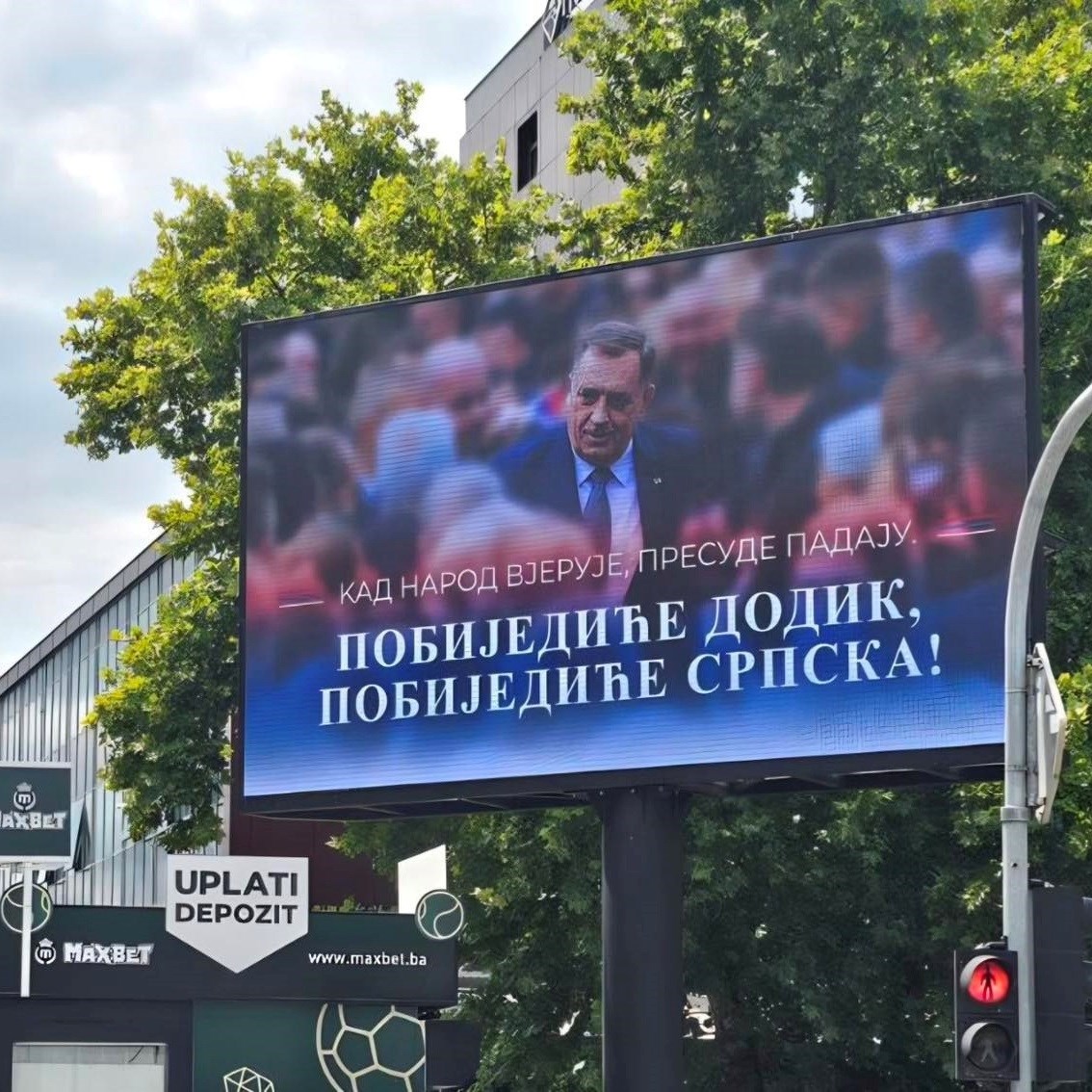 “Kad narod vjeruje, presude padaju. Pobijedit će Dodik, pobijedit će RS!”, piše na plakatima.