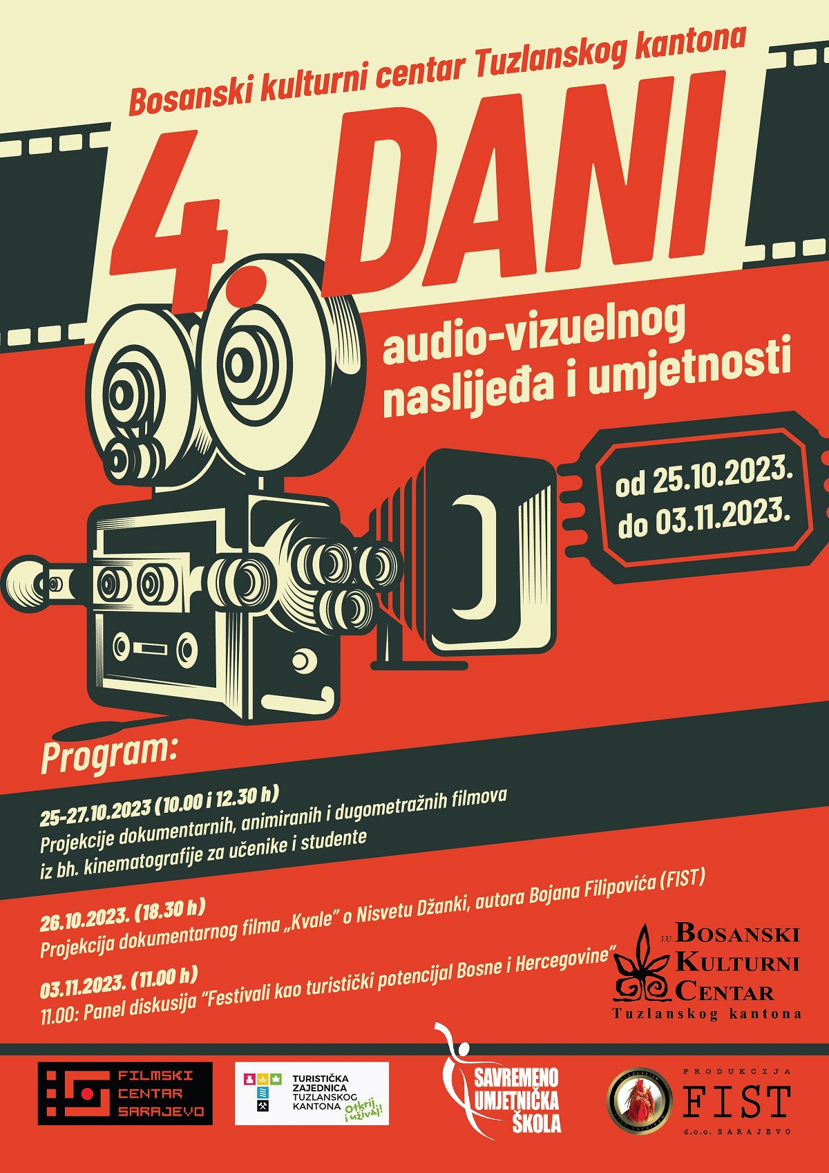 Manifestaciju, koju Bosanski kulturni centar Tuzlanskog kantona već četvrtu godinu za redom jedini u Bosni i Hercegovini organizira u ovom obliku, činit će projekcije bh. filmova za školsku populaciju, tuzlanska premijera dokumentarnog filma “Kvale”, te panel diskusija na kojoj će se govoriti o značaju festivala u razvoju bosanskohercegovačkog turizma.