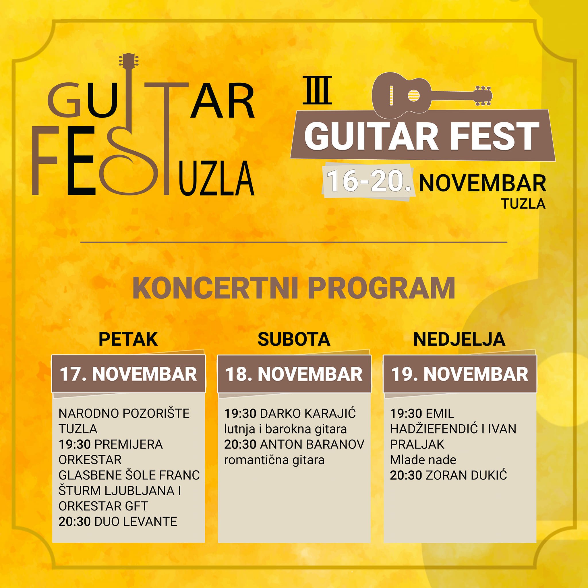 U nastavku trećeg Guitar festa, biće održano nekoliko koncerata, na kojima će nastupiti brojna svjetska gitaristička imena, poput Sanela Redžića, Darka Karajića, Antona Baranova, Zorana Dukića, te nekadašnji učenici tuzlanske muzičke škole Emil Hadžiefendić i Ivan Praljak. Festival ove godine ima i natjecateljski program, u okviru kojeg će, u nekoliko kategorija, pred međunarodnim žirijem, nastupiti mladi glazbenici iz regije.