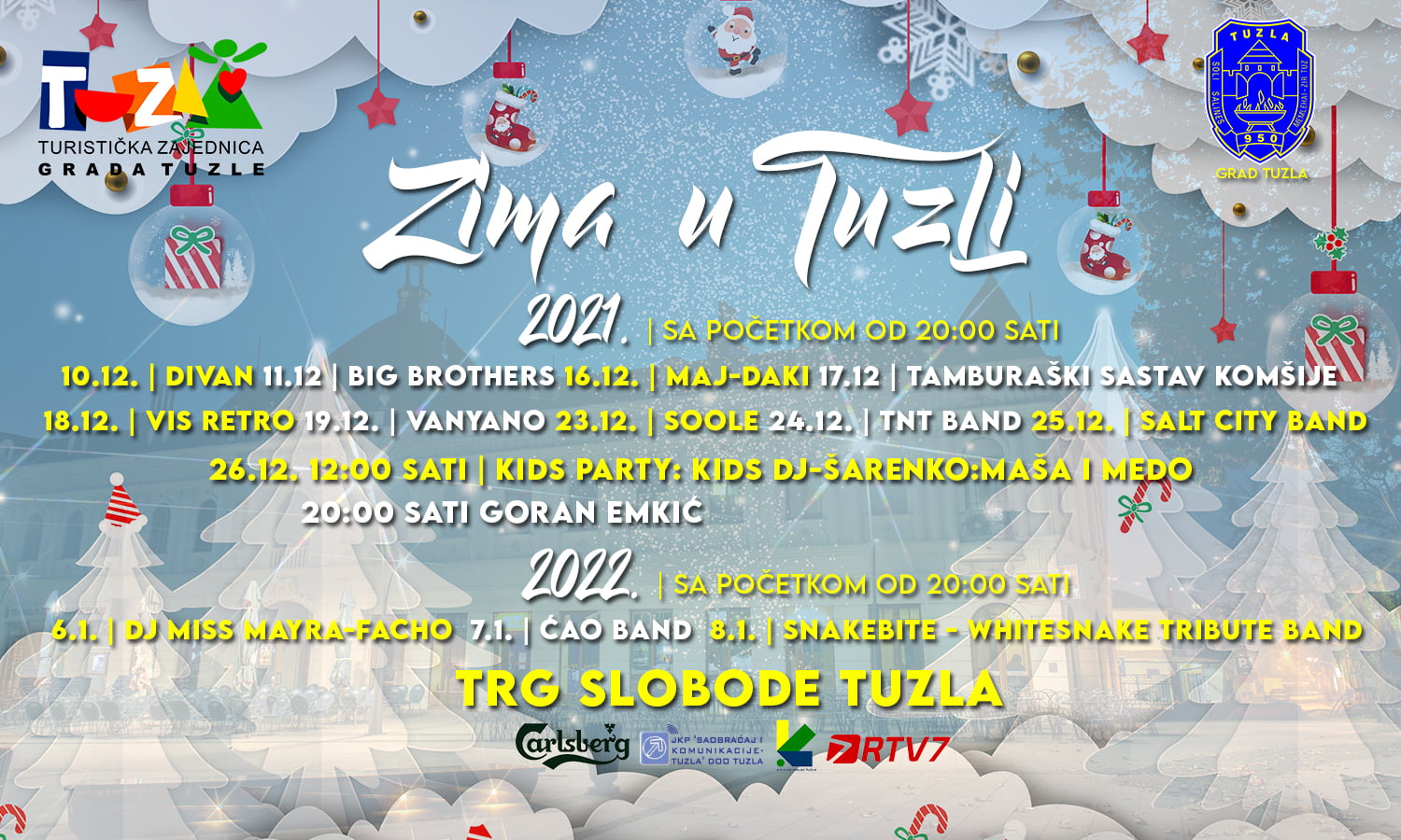 Manifestacija “Zima u Tuzli” ove godine započinje 10. prosinca i trajaće do 09. siječnja naredne godine. U ovih mjesec dana građanke i građani Tuzle, ali i gošće i gosti našeg grada, imaće priliku da na Trgu slobode, uživaju u prazničnim čarima i bogatoj gastro ponudi koju će kreirati obrtnici sa područja Tuzle.